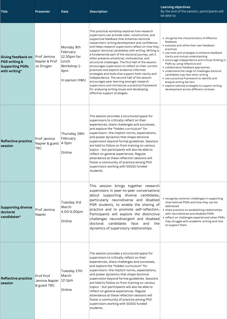 | Supporting PGRs with writing | 9 February 2026 ; 12:30-3:30 pm | Half day; at Heriot-Watt University | In person | SGSSS supervisors / To register click here | |