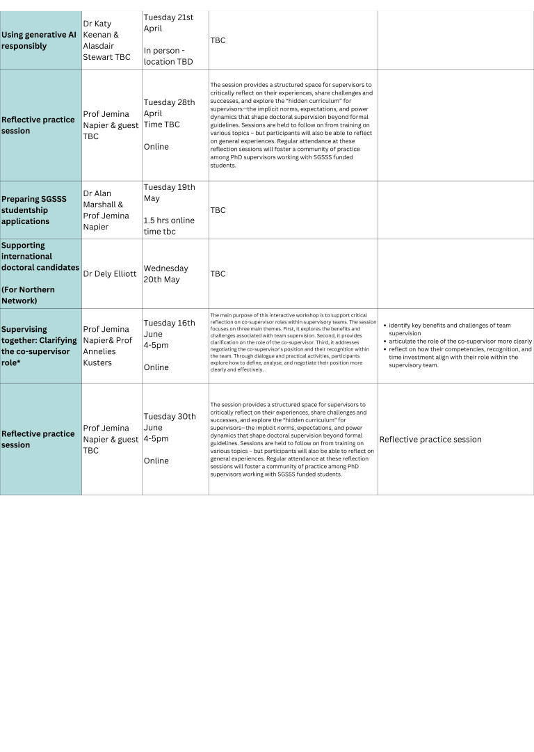 | April | Using generative AI responsibly | 21 April 2026 ; TBD | Half day; location TBD | In person | SGSSS supervisors and PGR students / Registration will open in late March |